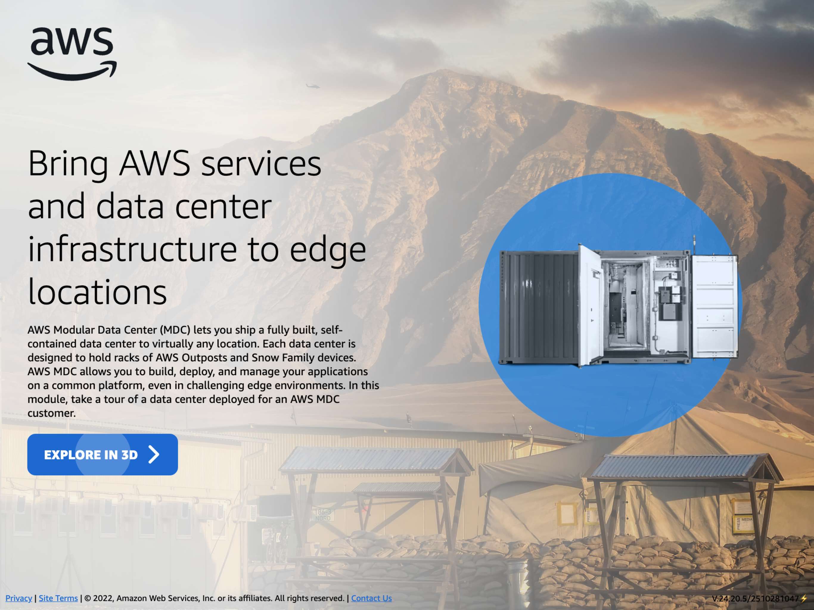 AWS Modular Data Center (MDC) is a new edge service that makes it simple and cost effective for defense and intelligence agencies to deploy modular data centers anywhere in the world to run low latency applications. With AWS MDC, customers reduce the time it takes to deploy data centers in austere environments, which are remote and have limited infrastructure, from years to weeks. AWS MDC is a self-contained modular data center, a physical, environmentally-controlled enclosure that holds up to five racks of AWS Outposts or AWS Snowball Edge devices, and can scale further through deployment of additional modules. Customers can proactively monitor and manage their modular data centers remotely using an AWS MDC management system.