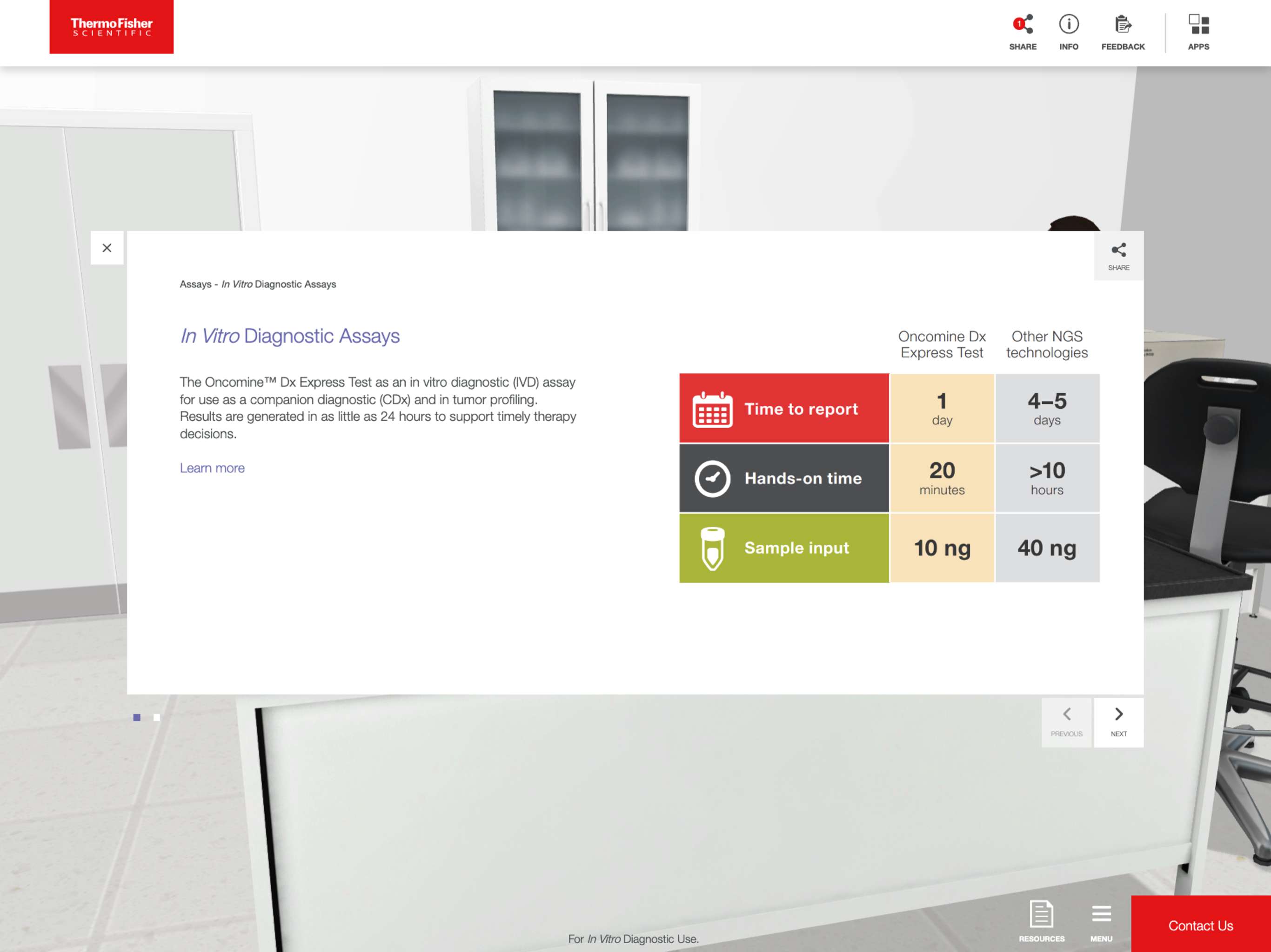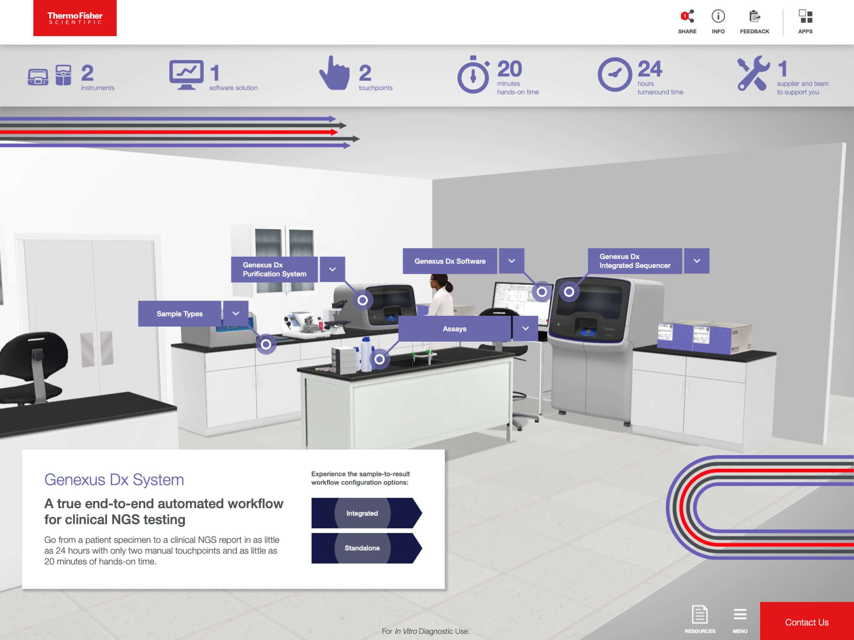 The Ion Torrent™ Genexus™ Dx Purification System is an in vitro diagnostic (IVD) instrument that automates nucleic acid extraction, purification, and quantification. With just one touchpoint and ten minutes of hands-on time, you can go from a patient specimen to purified and quantified nucleic acid that is ready to sequence on the Genexus™ Dx Integrated Sequencer.